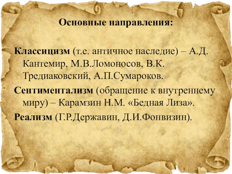 Классицизм (т.е. античное наследие) – А.Д. Кантемир, М.В.Ломоносов, В.К.Тредиаковский, А.П.Сумароков.