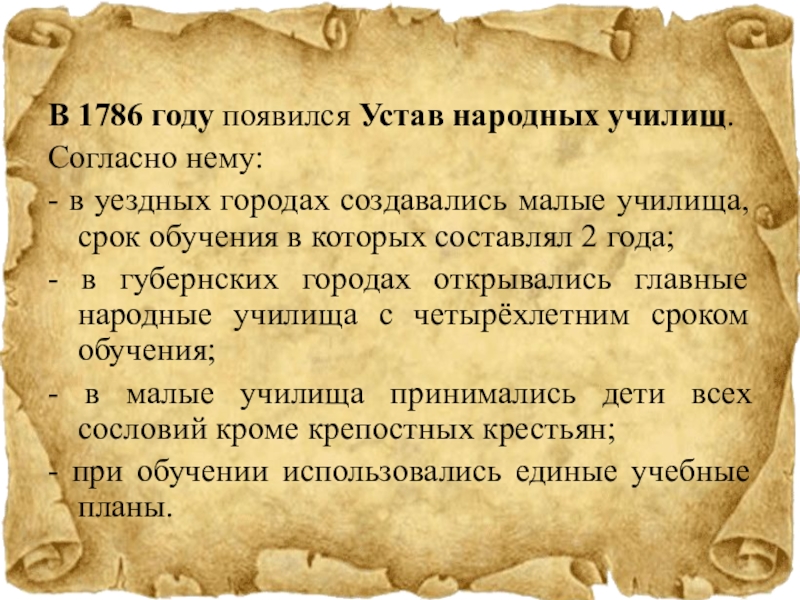 - в малые училища принимались дети всех сословий кроме крепостных крестьян;