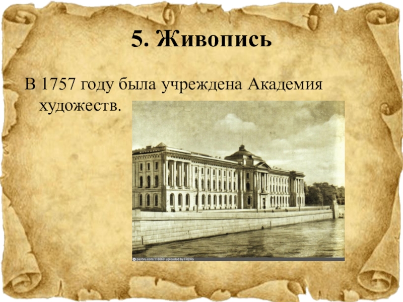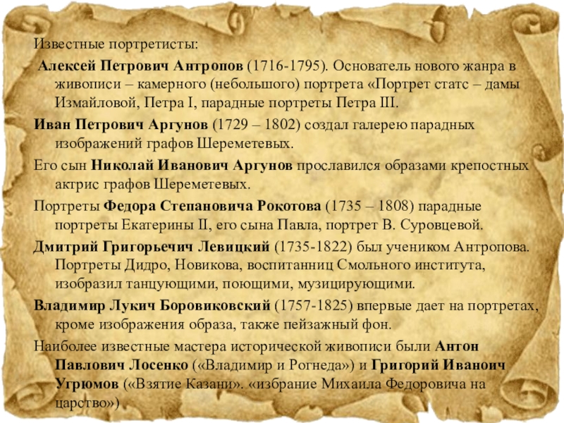 Наиболее известные мастера исторической живописи были Антон Павлович Лосенко («Владимир и Рогнеда») и Григорий Иваноич Угрюмов («Взятие Казани». «избрание Михаила Федоровича на царство»)