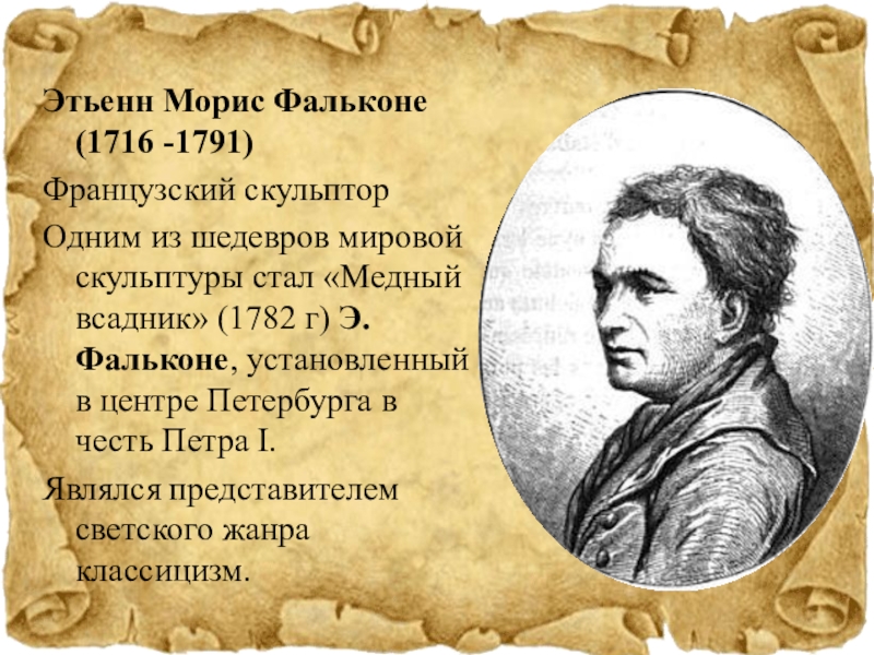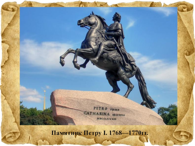 всадник» (1782 г) Э. Фальконе, установленный в центре Петербурга в честь Петра I.