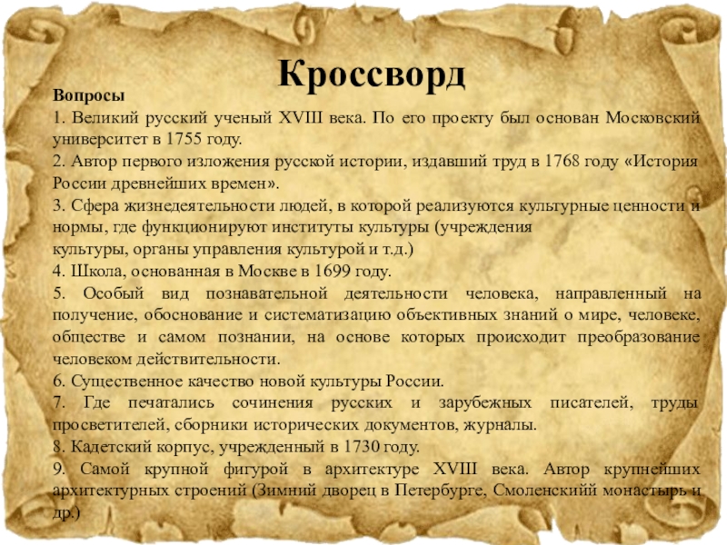 9. Самой крупной фигурой в архитектуре XVIII века. Автор крупнейших архитектурных строений (Зимний дворец в Петербурге, Смоленскийй монастырь и др.)