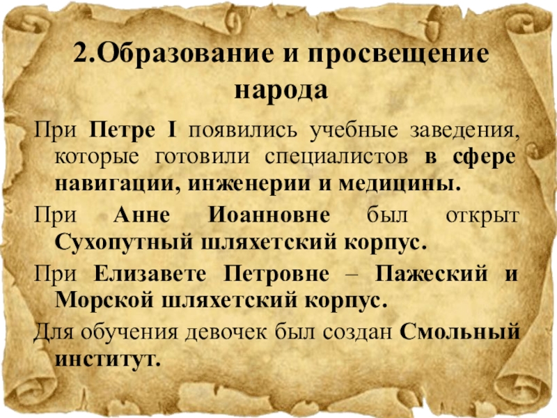 При Елизавете Петровне – Пажеский и Морской шляхетский корпус.