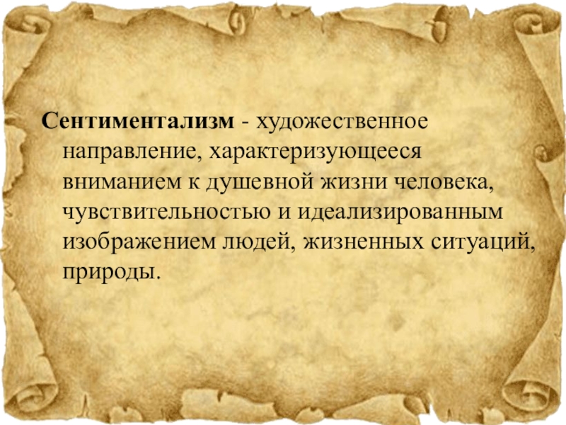 Слайд 20Сентиментализм - художественное направление, характеризующееся вниманием к душевной жизни человека, чувствительностью