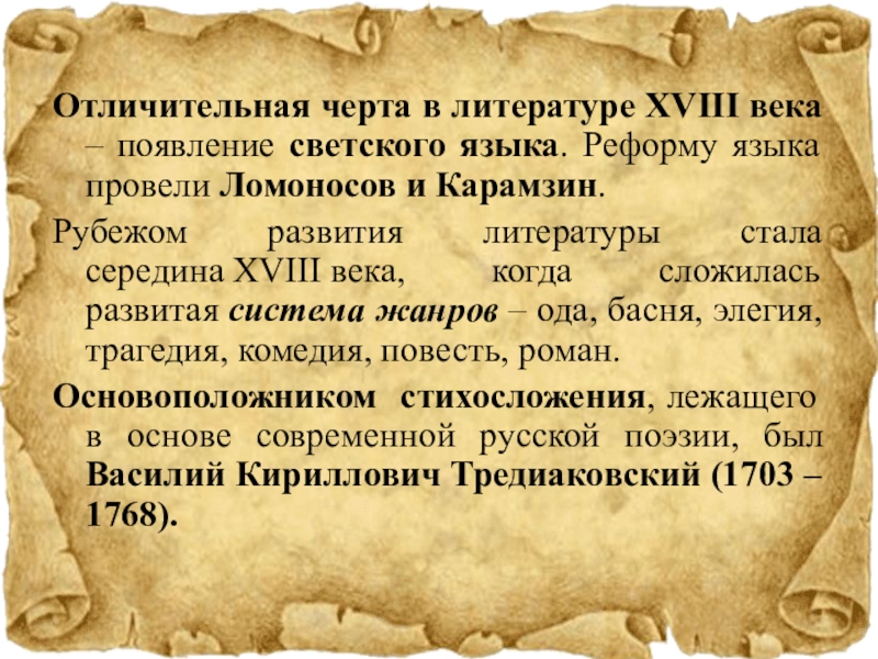 Слайд 15Отличительная черта в литературе XVIII века – появление светского языка. Реформу