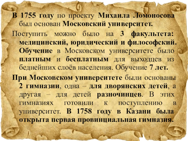При Московском университете были основаны 2 гимназии, одна – для дворянских детей, а другая – для детей разночинцев. В этих гимназиях готовили к поступлению в университет. В 1758 году в Казани была открыта первая провинциальная гимназия.