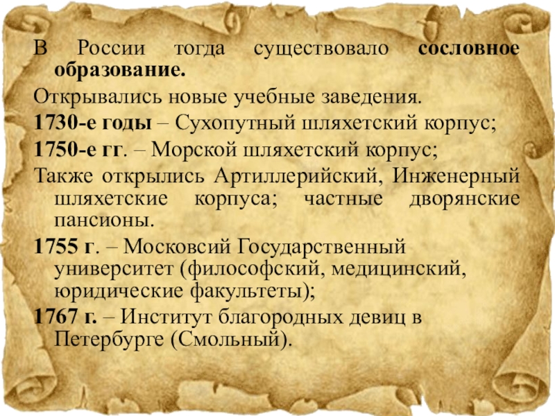 Также открылись Артиллерийский, Инженерный шляхетские корпуса; частные дворянские пансионы.