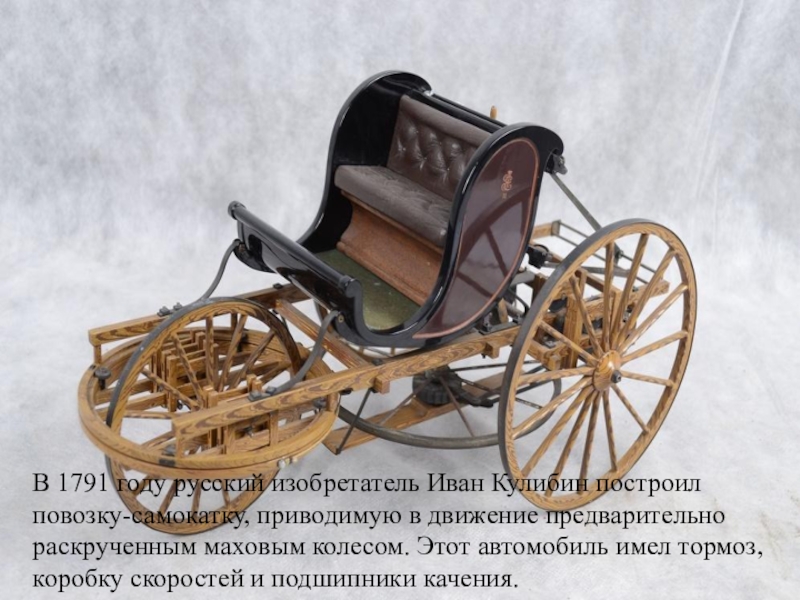 Слайд 25В 1791 году русский изобретатель Иван Кулибин построил повозку-самокатку, приводимую в