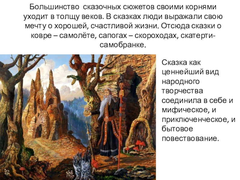 Сказка как ценнейший вид народного творчества соединила в себе и мифическое, и приключенческое, и бытовое повествование.