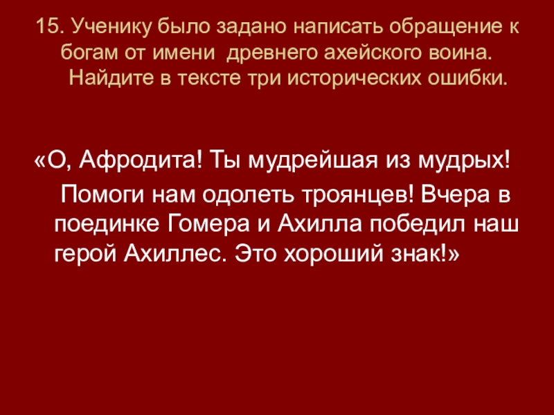 Помоги нам одолеть троянцев! Вчера в поединке Гомера и Ахилла победил наш герой Ахиллес. Это хороший знак!»