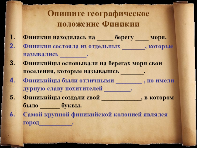 Финикийцы основывали на берегах моря свои поселения, которые назывались _______.