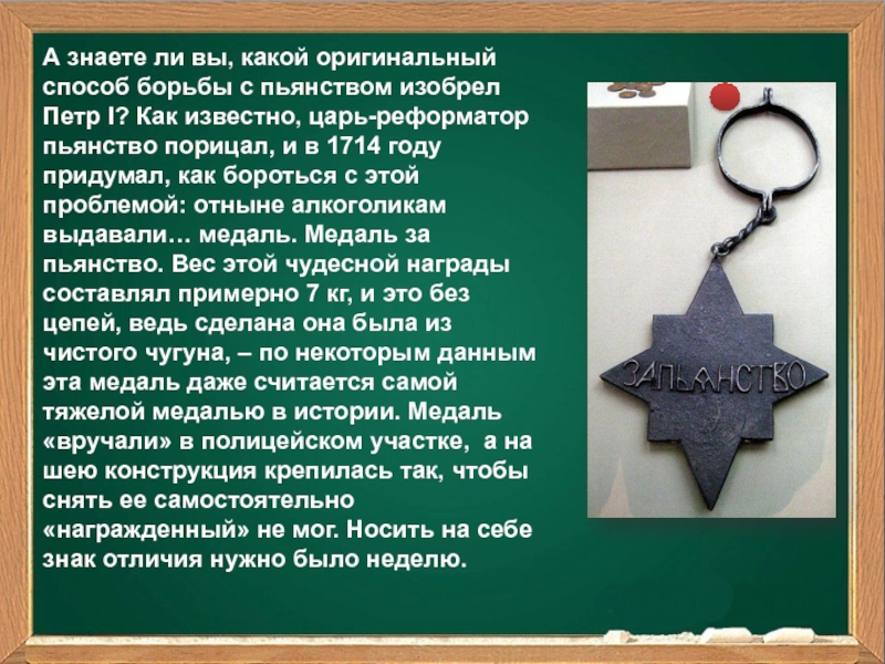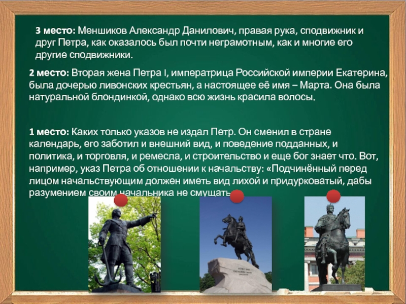 1 место: Каких только указов не издал Петр. Он сменил в стране календарь, его заботил и внешний вид, и поведение подданных, и политика, и торговля, и ремесла, и строительство и еще бог знает что. Вот, например, указ Петра об отношении к начальству: «Подчинённый перед лицом начальствующим должен иметь вид лихой и придурковатый, дабы разумением своим начальника не смущать».
