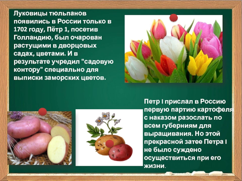Петр I прислал в Россию первую партию картофеля с наказом разослать по всем губерниям для выращивания. Но этой прекрасной затее Петра I не было суждено осуществиться при его жизни.