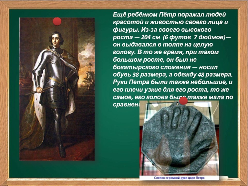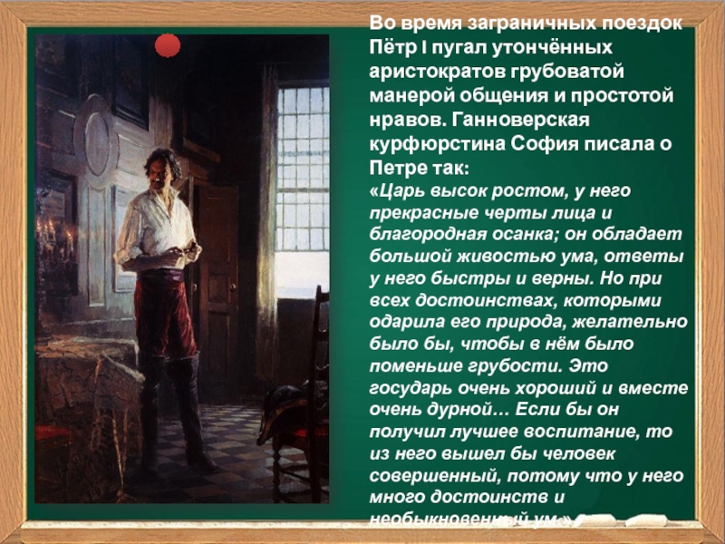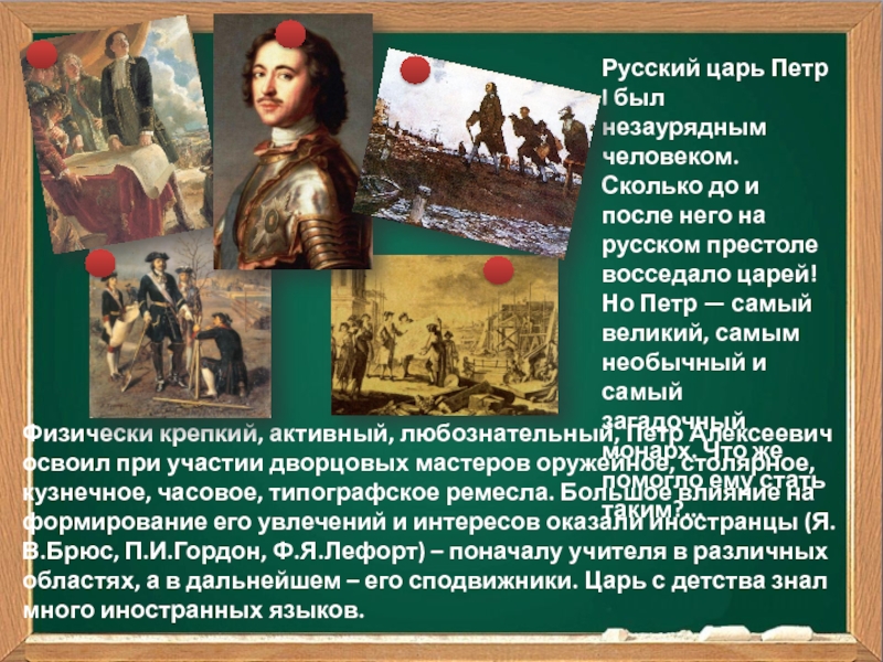 Физически крепкий, активный, любознательный, Петр Алексеевич освоил при участии дворцовых мастеров оружейное, столярное, кузнечное, часовое, типографское ремесла. Большое влияние на формирование его увлечений и интересов оказали иностранцы (Я.В.Брюс, П.И.Гордон, Ф.Я.Лефорт) – поначалу учителя в различных областях, а в дальнейшем – его сподвижники. Царь с детства знал много иностранных языков.