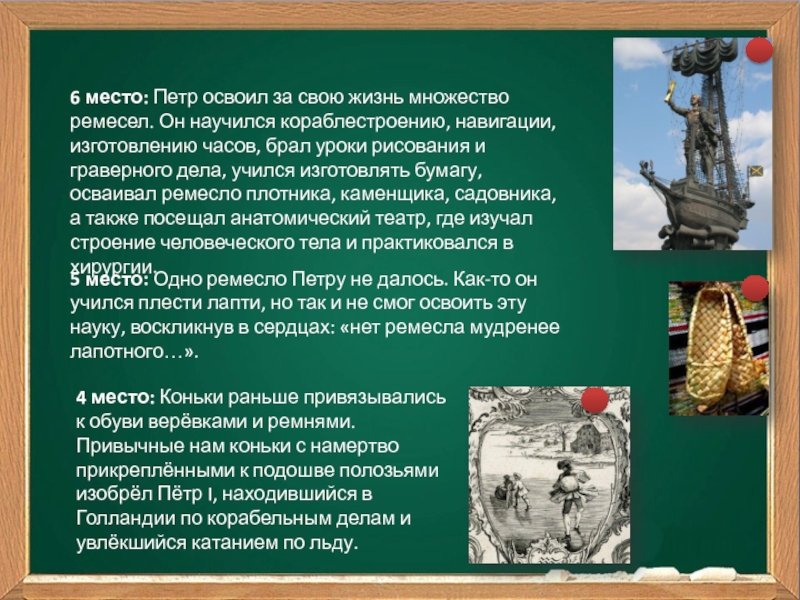 5 место: Одно ремесло Петру не далось. Как-то он учился плести лапти, но так и не смог освоить эту науку, воскликнув в сердцах: «нет ремесла мудренее лапотного…».