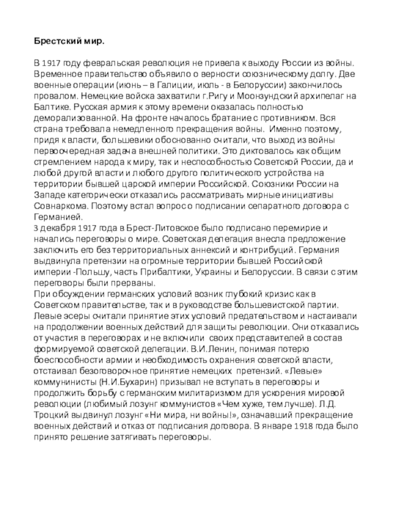 из войны. Временное правительство объявило о верности союзническому долгу. Две военные операции (июнь – в Галиции, июль - в Белоруссии) закончилось провалом. Немецкие войска захватили г.Ригу и Моонзундский архипелаг на Балтике. Русская армия к этому времени оказалась полностью деморализованной. На фронте началось братание с противником. Вся страна требовала немедленного прекращения войны. Именно поэтому, придя к власти, большевики обоснованно считали, что выход из войны первоочередная задача внешней политики. Это диктовалось как общим стремлением народа к миру, так и неспособностью Советской России, да и любой другой власти и любого другого политического устройства на территории бывшей царской империи Российской. Союзники России на Западе категорически отказались рассматривать мирные инициативы Совнаркома. Поэтому встал вопрос о подписании сепаратного договора с Германией.