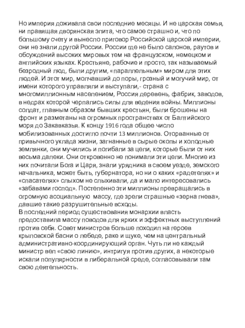 правящая дворянская элита, что самое страшно и, что по большому счету и вынесло приговор Российской царской империи, они не знали другой России. России где не было салонов, раутов и обсуждений высоких мировых тем на французском, немецком и английских языках. Крестьяне, рабочие и просто, так называемый безродный люд, были другим, «параллельным» миром для этих людей. И этот мир, молчавший до поры, грозный и могучий мир, от имени которого управляли и выступали,- страна с многомиллионным населением, Россия деревень, фабрик, заводов, в недрах которой черпались силы для ведения войны. Миллионы солдат, главным образом бывших крестьян, были брошены на фронт и разметаны на огромных пространствах от Балтийского моря до Закавказья. К концу 1916 года общее число мобилизованных достигло почти 13 миллионов. Оторванные от привычного уклада жизни, загнанные в сырые окопы и холодные землянки, они мучились и погибали за цели, которые были от них весьма далеки. Они откровенно не понимали эти цели. Многие из них почитали Бога и Царя, знали урядника в своем уезде, земского начальника, может быть, губернатора, но ни о каких «радетелях» и «спасателях» слыхом не слыхивали, да и мало интересовались «забавами господ». Постепенно эти миллионы превращались в огромную асоциальную массу, где зрели страшные «зерна гнева», давшие такие разрушительные всходы.
