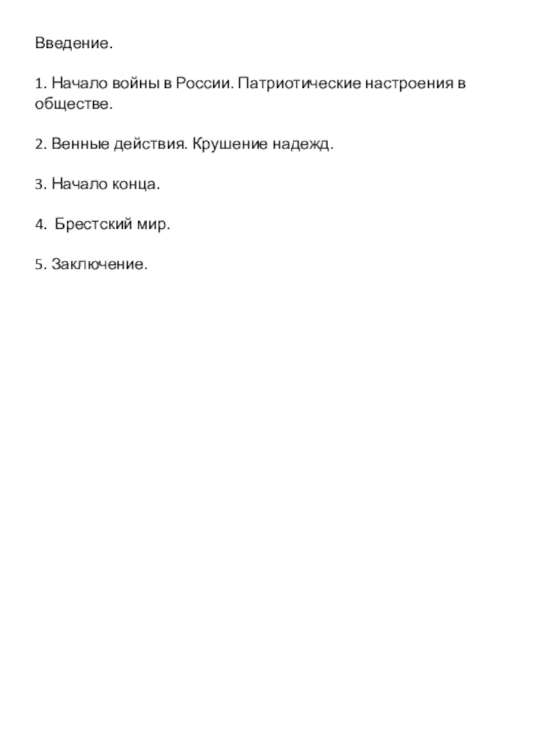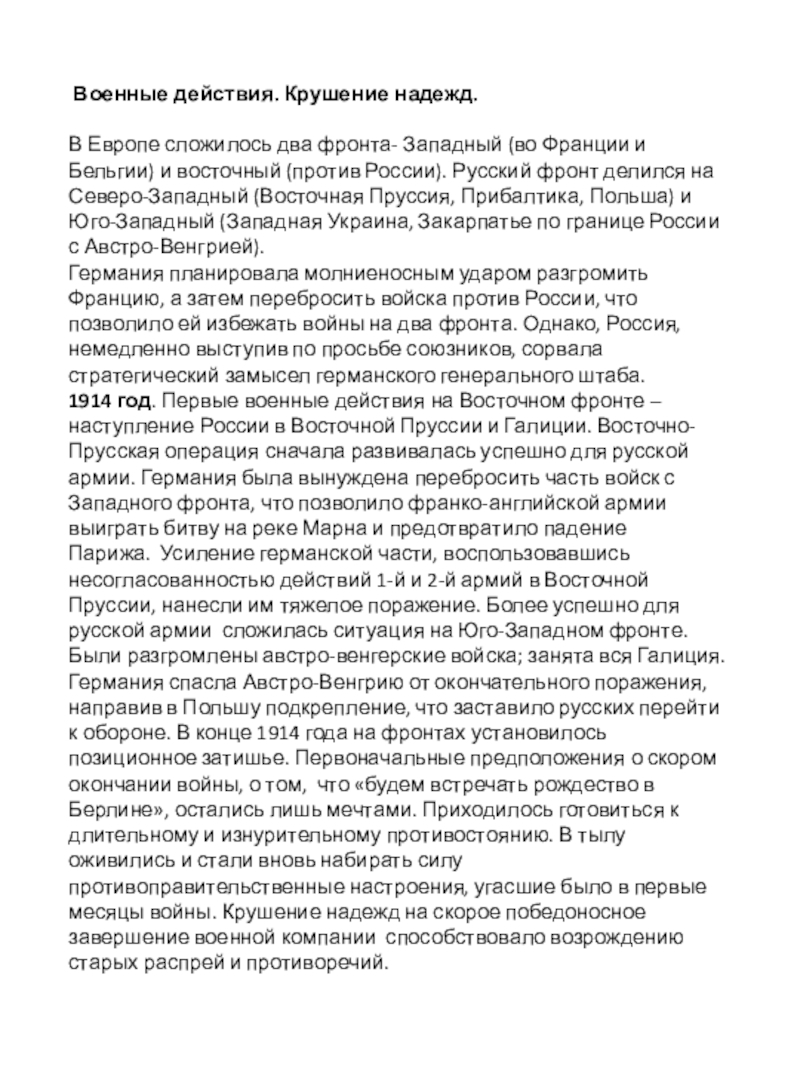 1914 год. Первые военные действия на Восточном фронте – наступление России в Восточной Пруссии и Галиции. Восточно-Прусская операция сначала развивалась успешно для русской армии. Германия была вынуждена перебросить часть войск с Западного фронта, что позволило франко-английской армии выиграть битву на реке Марна и предотвратило падение Парижа. Усиление германской части, воспользовавшись несогласованностью действий 1-й и 2-й армий в Восточной Пруссии, нанесли им тяжелое поражение. Более успешно для русской армии сложилась ситуация на Юго-Западном фронте. Были разгромлены австро-венгерские войска; занята вся Галиция. Германия спасла Австро-Венгрию от окончательного поражения, направив в Польшу подкрепление, что заставило русских перейти к обороне. В конце 1914 года на фронтах установилось позиционное затишье. Первоначальные предположения о скором окончании войны, о том, что «будем встречать рождество в Берлине», остались лишь мечтами. Приходилось готовиться к длительному и изнурительному противостоянию. В тылу оживились и стали вновь набирать силу противоправительственные настроения, угасшие было в первые месяцы войны. Крушение надежд на скорое победоносное завершение военной компании способствовало возрождению старых распрей и противоречий.