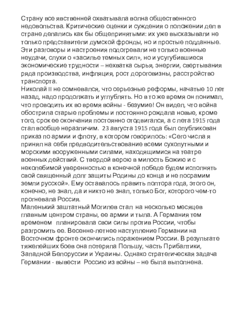 Николай II не сомневался, что серьезные реформы, начатые 10 лет назад, надо продолжать и углублять. Но в то же время он понимал, что проводить их во время войны - безумие! Он видел, что война обострила старые проблемы и постоянно рождала новые, кроме того, срок ее окончания постоянно отодвигался, а с лета 1915 года стал вообще неразличим. 23 августа 1915 года был опубликован приказ по армии и флоту, в котором говорилось: «Сего числа я принял на себя предводительствование всеми сухопутными и морскими вооруженными силами, находящимися на театре военных действий. С твердой верою в милость Божию и с неколебимой уверенностью в конечной победе будем исполнять свой священный долг защиты Родины до конца и не посрамим земли русской». Ему оставалось править полтора года, этого он, конечно, не знал, да и никто не знал, только Бог, которого чем-то прогневала Россия.