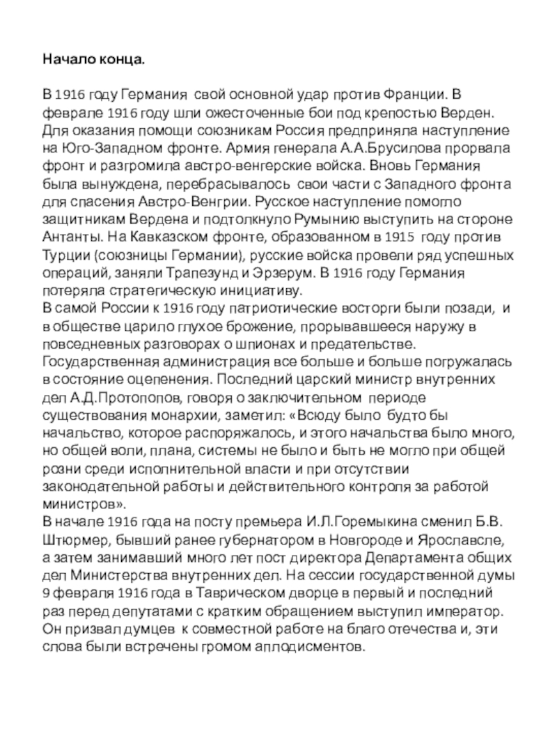 В начале 1916 года на посту премьера И.Л.Горемыкина сменил Б.В.Штюрмер, бывший ранее губернатором в Новгороде и Ярославсле, а затем занимавший много лет пост директора Департамента общих дел Министерства внутренних дел. На сессии государственной думы 9 февраля 1916 года в Таврическом дворце в первый и последний раз перед депутатами с кратким обращением выступил император. Он призвал думцев к совместной работе на благо отечества и, эти слова были встречены громом аплодисментов.