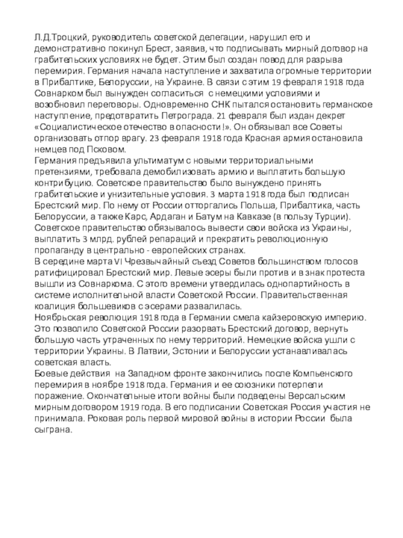 Германия предъявила ультиматум с новыми территориальными претензиями, требовала демобилизовать армию и выплатить большую контрибуцию. Советское правительство было вынуждено принять грабительские и унизительные условия. 3 марта 1918 года был подписан Брестский мир. По нему от России отторгались Польша, Прибалтика, часть Белоруссии, а также Карс, Ардаган и Батум на Кавказе (в пользу Турции). Советское правительство обязывалось вывести свои войска из Украины, выплатить 3 млрд. рублей репараций и прекратить революционную пропаганду в центрально - европейских странах.