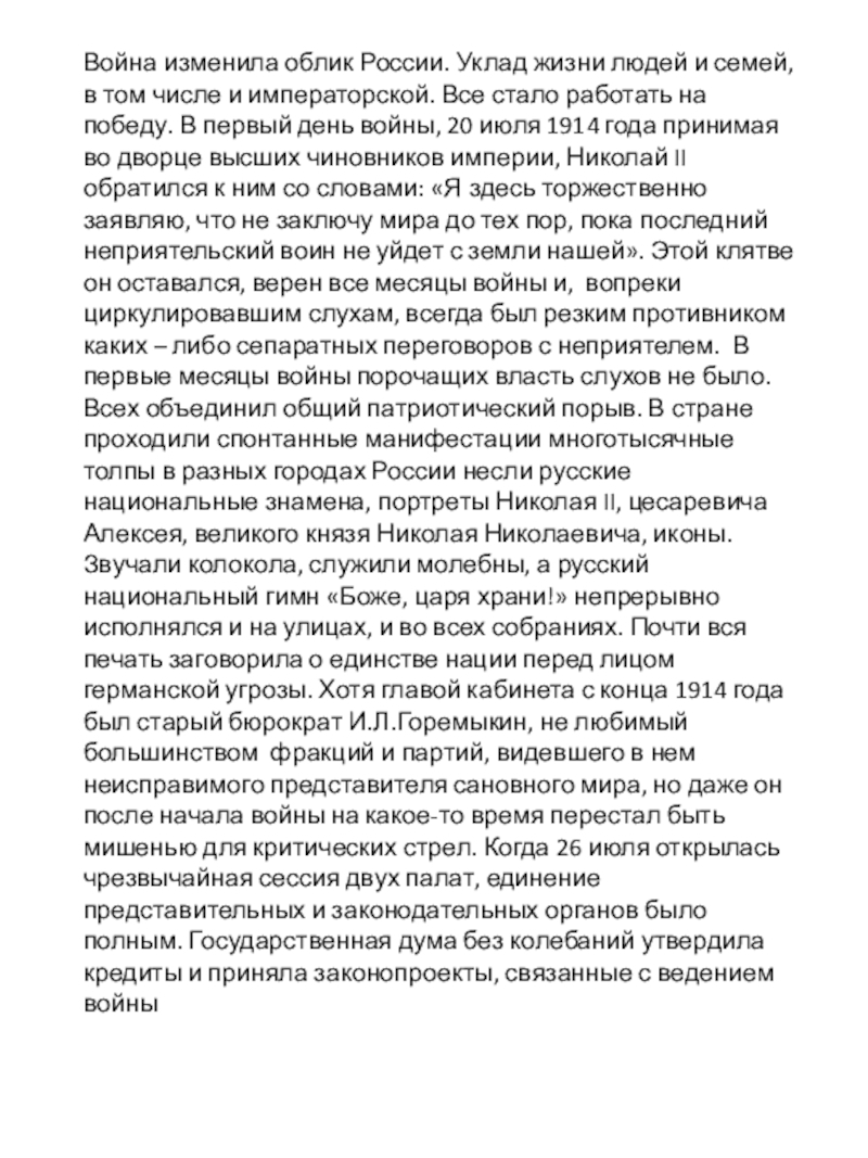 числе и императорской. Все стало работать на победу. В первый день войны, 20 июля 1914 года принимая во дворце высших чиновников империи, Николай II обратился к ним со словами: «Я здесь торжественно заявляю, что не заключу мира до тех пор, пока последний неприятельский воин не уйдет с земли нашей». Этой клятве он оставался, верен все месяцы войны и, вопреки циркулировавшим слухам, всегда был резким противником каких – либо сепаратных переговоров с неприятелем. В первые месяцы войны порочащих власть слухов не было.