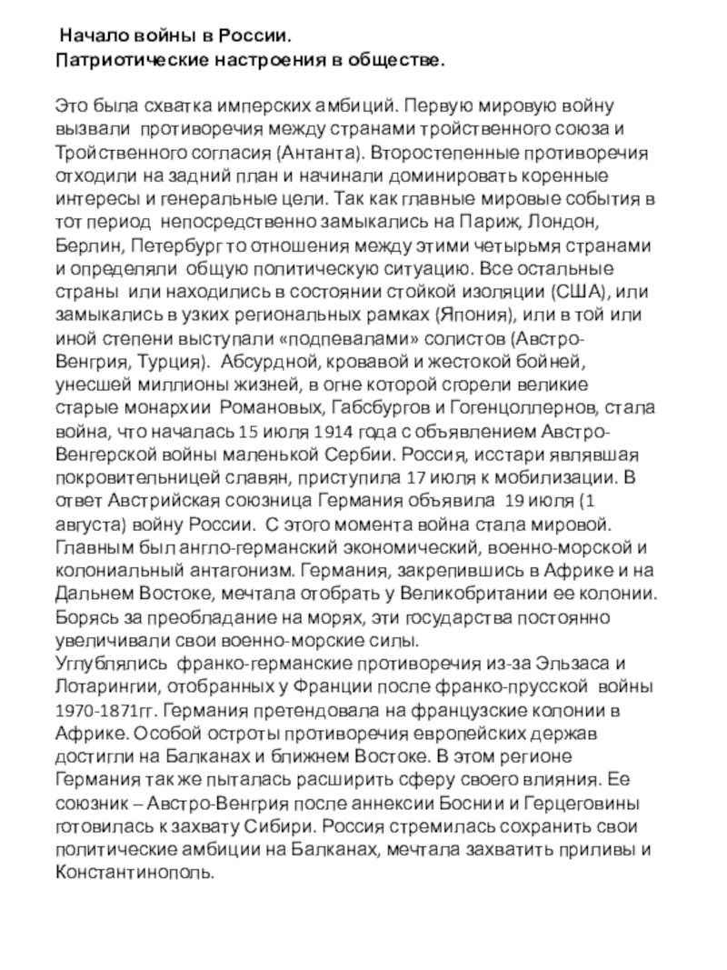Углублялись франко-германские противоречия из-за Эльзаса и Лотарингии, отобранных у Франции после франко-прусской войны 1970-1871гг. Германия претендовала на французские колонии в Африке. Особой остроты противоречия европейских держав достигли на Балканах и ближнем Востоке. В этом регионе Германия так же пыталась расширить сферу своего влияния. Ее союзник – Австро-Венгрия после аннексии Боснии и Герцеговины готовилась к захвату Сибири. Россия стремилась сохранить свои политические амбиции на Балканах, мечтала захватить приливы и Константинополь.