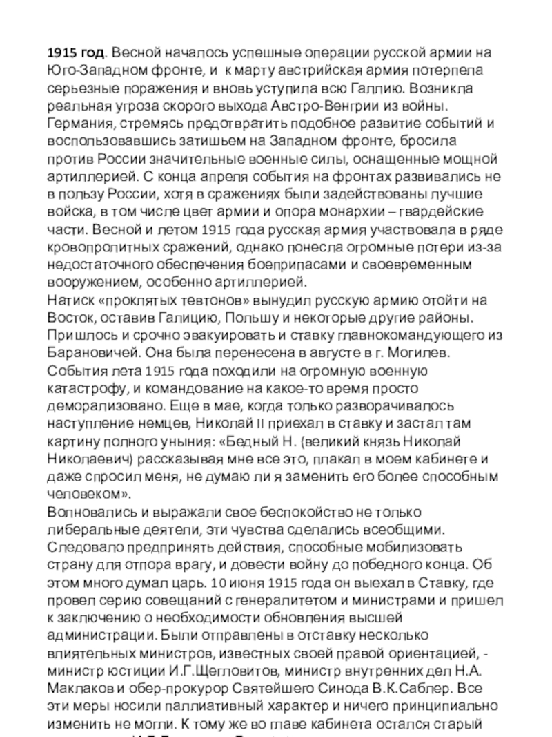 и к марту австрийская армия потерпела серьезные поражения и вновь уступила всю Галлию. Возникла реальная угроза скорого выхода Австро-Венгрии из войны. Германия, стремясь предотвратить подобное развитие событий и воспользовавшись затишьем на Западном фронте, бросила против России значительные военные силы, оснащенные мощной артиллерией. С конца апреля события на фронтах развивались не в пользу России, хотя в сражениях были задействованы лучшие войска, в том числе цвет армии и опора монархии – гвардейские части. Весной и летом 1915 года русская армия участвовала в ряде кровопролитных сражений, однако понесла огромные потери из-за недостаточного обеспечения боеприпасами и своевременным вооружением, особенно артиллерией.
