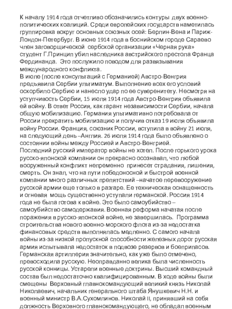 Последний русский император войны не хотел. После горького урока русско-японской компании он прекрасно осознавал, что любой вооруженный конфликт непременно принесет страдания, лишения, смерть. Он знал, что на пути победоносной и быстрой военной компании много различных препятствий –начатое перевооружение русской армии еще только в разгаре. Ее техническая оснащенность и огневая мощь существенно уступали германской. Россия 1914 года не была готова к войне. Это было самоубийство – самоубийство самодержавия. Военная реформа начатая после поражения в русско-японской войне, не завершилась. Программа строительства нового военно-морского флота из-за недостатка финансовых средств выполнялась медленно. С самого начала войны из-за низкой пропускной способности железных дорог русская армия испытывала недостаток в подвозе резервов и боеприпасов. Германская артиллерия значительно, как уже было отмечено, превосходила русскую. Неоправданно велика была численность русской конницы. Устарели военные доктрины. Высший командный состав был недостаточно квалифицированным. В ходе войны были смещены Верховный главнокомандующий великий князь Николай Николаевич, начальник генерального штаба Янушкевич Н.Н. и военный министр В.А.Сухомлинов. Николай II, принявший на себя должность Верховного главнокомандующего, не обладал военным опытом и руководил боевыми действиями лишь номинально. Свою бездарность в ходе войны продемонстрировали многие командующие фронтами и армиями.