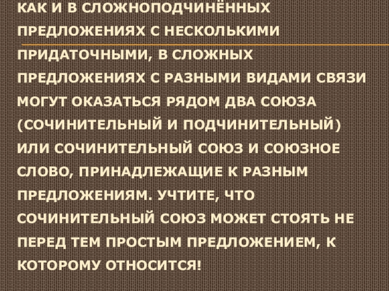 Слайд 8По общим правилам два союза (союз и союзное слово), принадлежащие разным