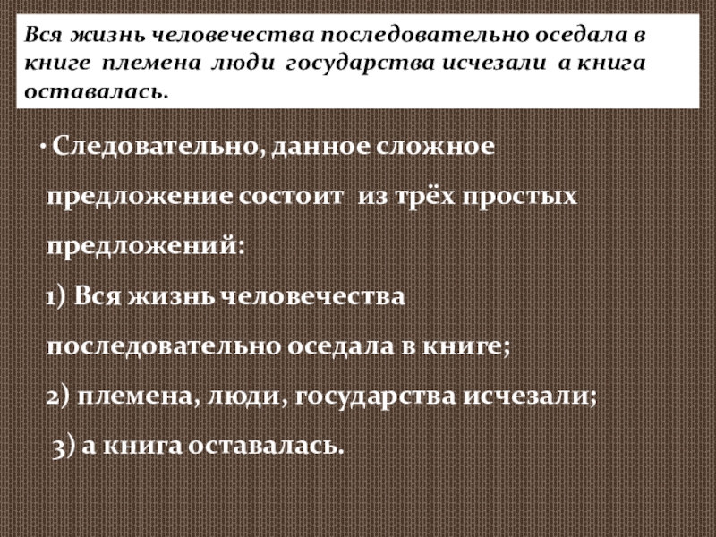 б) 1:2: вся жизнь человечества последовательно оседала в книге: племена, люди, государства исчезали – это бессоюзное предложение, отношения пояснительные (2 пр. поясняет, конкретизирует содержание 1)