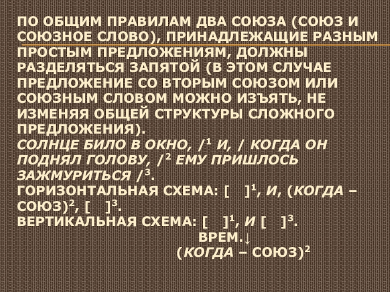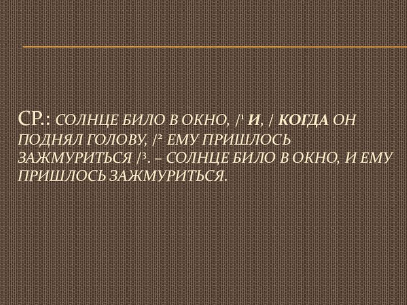Слайд 9Ср.: Солнце било в окно, /1 и, / когда он поднял