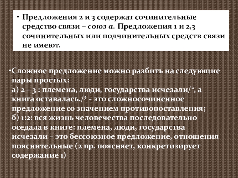 : племена, люди, государства исчезали/2, а книга оставалась./3 - это сложносочиненное предложение со значением противопоставления;