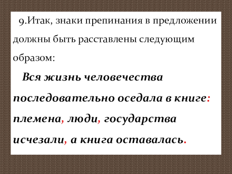 Слайд 179.Итак, знаки препинания в предложении должны быть расставлены следующим образом: