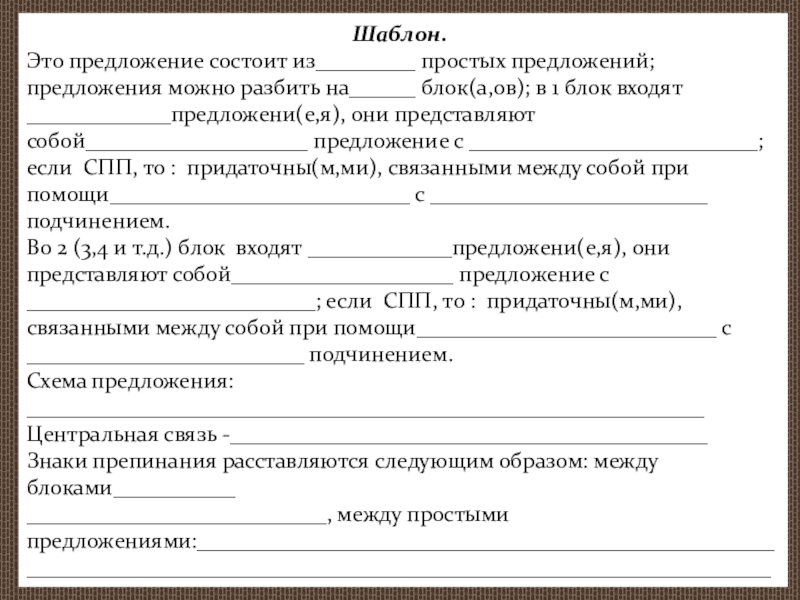 Это предложение состоит из_________ простых предложений; предложения можно разбить на______ блок(а,ов); в 1 блок входят _____________предложени(е,я), они представляют собой____________________ предложение с __________________________; если СПП, то : придаточны(м,ми), связанными между собой при помощи___________________________ с _________________________ подчинением.