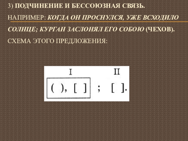 Слайд 43) подчинение и бессоюзная связь. Например: Когда он проснулся, уже всходило солнце;