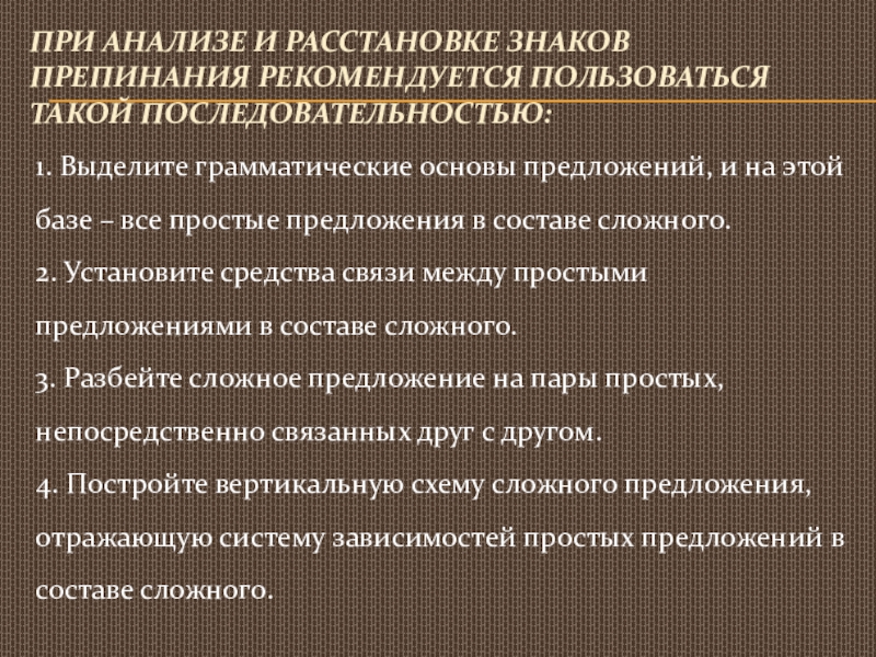 Слайд 19При анализе и расстановке знаков препинания рекомендуется пользоваться такой последовательностью:
