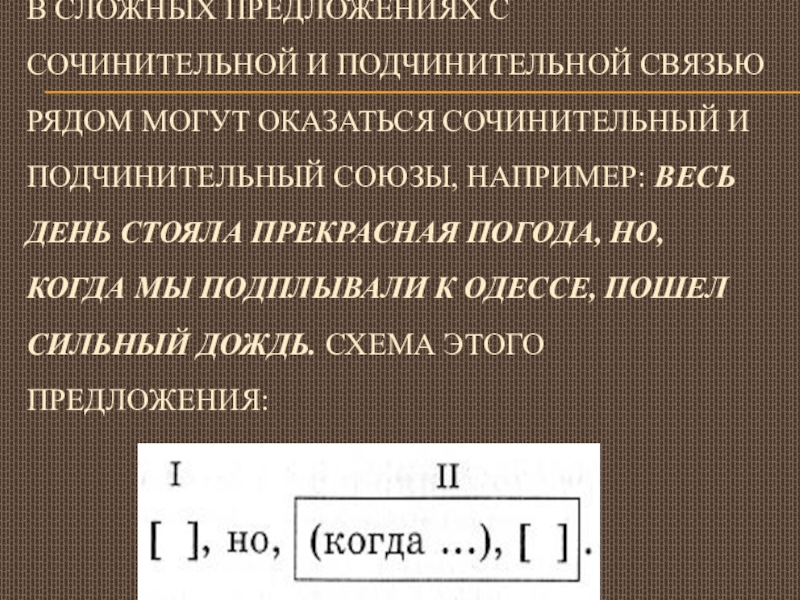 сочинительный и подчинительный союзы, например: Весь день стояла прекрасная погода, но, когда мы подплывали к Одессе, пошел сильный дождь. Схема этого предложения: