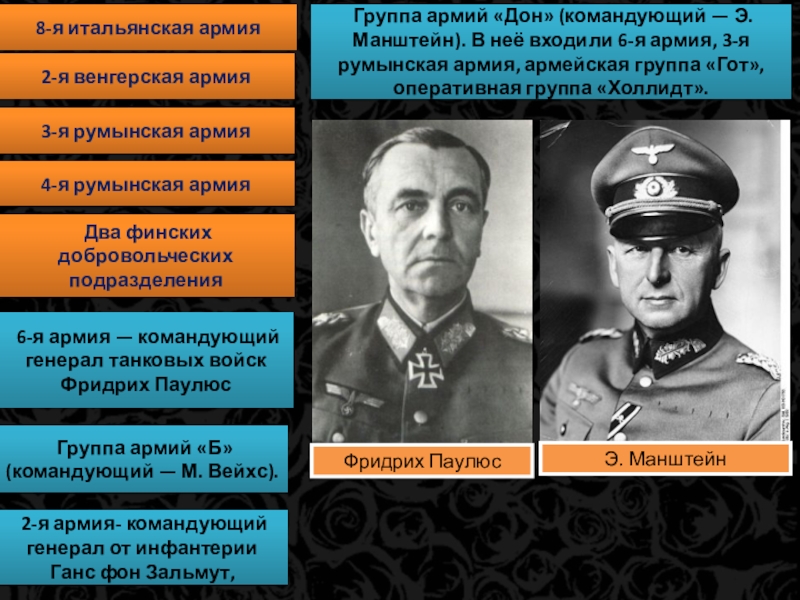 Группа армий «Дон» (командующий — Э. Манштейн). В неё входили 6-я армия, 3-я румынская армия, армейская группа «Гот», оперативная группа «Холлидт».