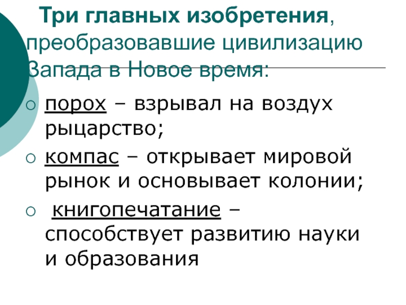 Слайд 6 Три главных изобретения, преобразовавшие цивилизацию Запада в Новое время: