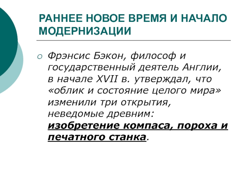 Англии, в начале XVII в. утверждал, что «облик и состояние целого мира» изменили три открытия, неведомые древним: изобретение компаса, пороха и печатного станка.