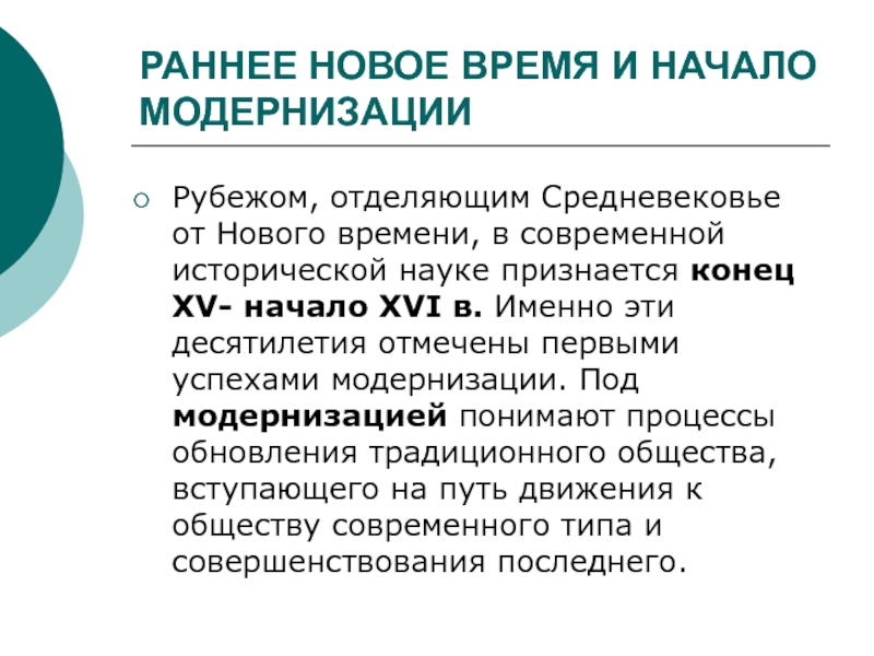в современной исторической науке признается конец XV- начало XVI в. Именно эти десятилетия отмечены первыми успехами модернизации. Под модернизацией понимают процессы обновления традиционного общества, вступающего на путь движения к обществу современного типа и совершенствования последнего.
