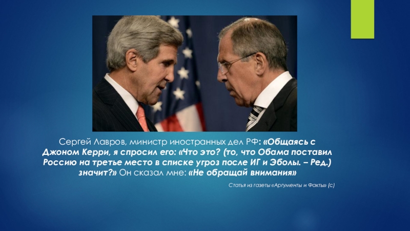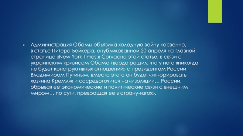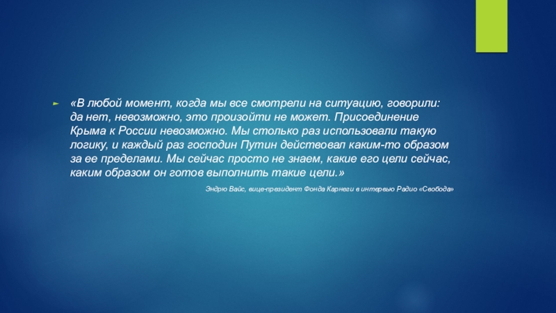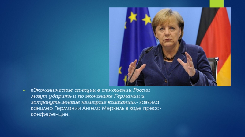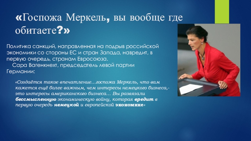 «Создаётся такое впечатление…госпожа Меркель, что вам кажется ещё более важным, чем интересы немецкого бизнеса,- это интересы американского бизнеса… Вы развязали бессмысленную экономическую войну, которая вредит в первую очередь немецкой и европейской экономике»