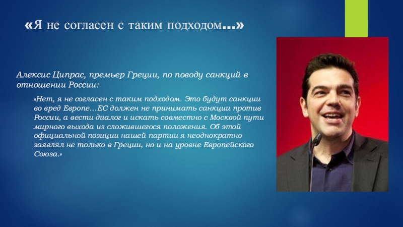 «Нет, я не согласен с таким подходом. Это будут санкции во вред Европе…ЕС должен не принимать санкции против России, а вести диалог и искать совместно с Москвой пути мирного выхода из сложившегося положения. Об этой официальной позиции нашей партии я неоднократно заявлял не только в Греции, но и на уровне Европейского Союза.»