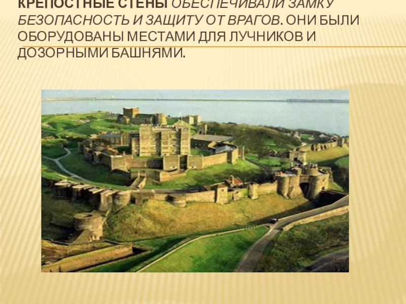 Слайд 7Крепостны̀е стены обеспечивали замку безопасность и защиту от врагов. Они были оборудованы