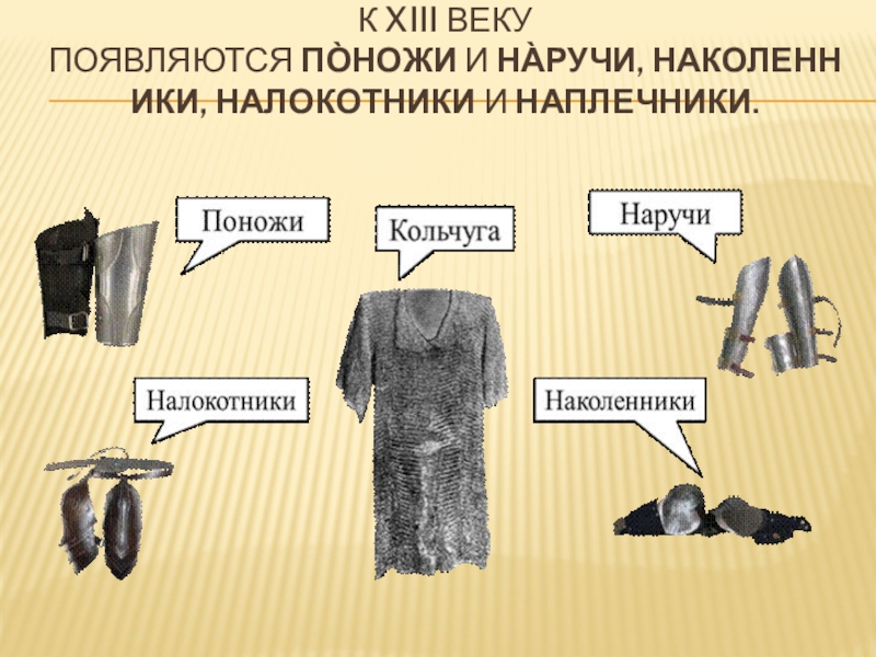 Слайд 15К XIII веку появляются по̀ножи и на̀ручи, наколенники, налокотники и наплечники.