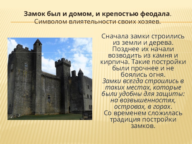 замки строились из земли и дерева. Позднее их начали возводить из камня и кирпича. Такие постройки были прочнее и не боялись огня.