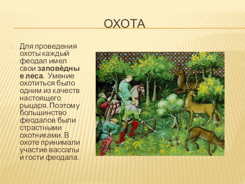 Для проведения охоты каждый феодал имел свои заповѐдные леса. Умение охотиться было