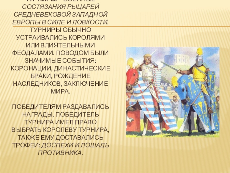Слайд 19Турнѝры – военные состязания рыцарей средневековой Западной Европы в силе и ловкости.