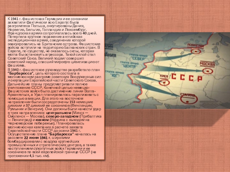 В 1940 г. фашистское руководство разработало план “Барбаросса”, цель которого состояла в молниеносном разгроме советских Вооруженных сил и оккупации Европейской части Советского Союза. Дальнейшие планы предусматривали полное уничтожение СССР. Конечной целью немецко-фашистских войск было достижение линии Волга-Архангельск, а Урал планировалось парализовать с помощью авиации. Для этого на восточном направлении были сосредоточены 153 немецкие дивизии и 37 дивизий ее союзников (Финляндии, Румынии и Венгрии). Они должны были нанести удар в трех направлениях: центральном (Минск — Смоленск — Москва), северо-западном (Прибалтика — Ленинград) и южном (Украина с выходом на Черноморское побережье). Планировалась молниеносная кампания в расчете захвата Европейской части СССР до осени 1941 г. Осуществление плана “Барбаросса” началось на рассвете 22 июня 1941 г. широкими бомбардировками с воздуха крупнейших промышленных и стратегических центров, а также наступлением сухопутных войск Германии и ее союзников по всей европейской границе СССР (на протяжении 4,5 тыс. км).