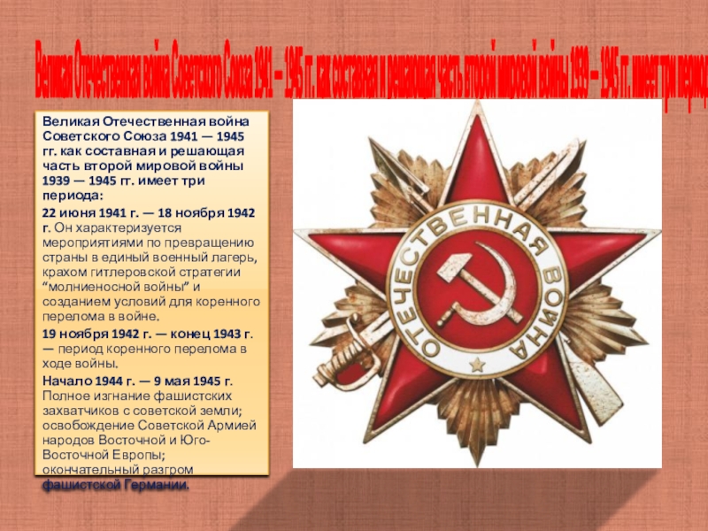 Великая Отечественная война Советского Союза 1941 — 1945 гг. как составная и решающая часть второй мировой войны 1939 — 1945 гг. имеет три периода: